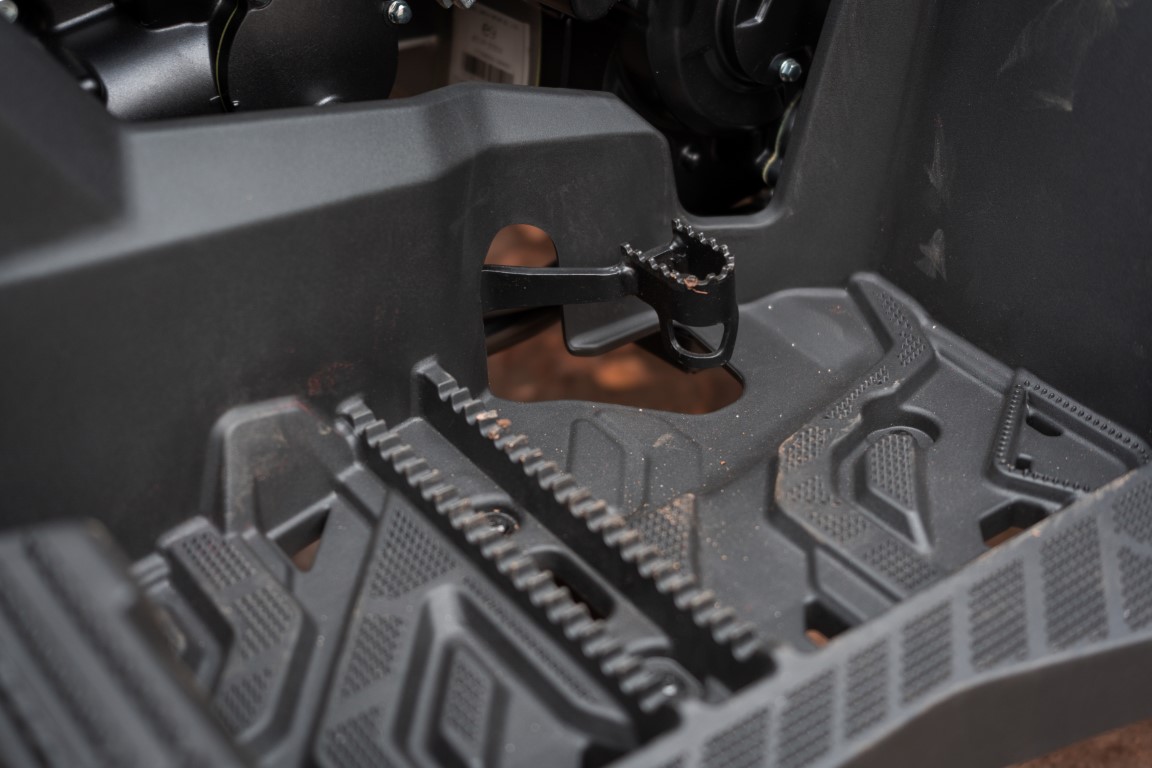 Двигатель сблокирован с бесступенчатой трансмиссией и приводит заднюю ось посредством карданной передачи. В отличие от цепи, кардан не надо мыть после каждой вылазки на бездорожье. Понижающая передача поможет там, где нужна максимальная тяга.